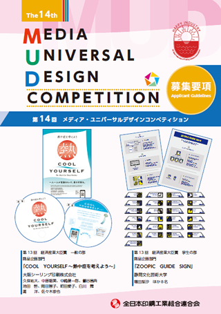 全日本印刷工業組合連合会では「すべての人に優しく、誰もが快適に利用できること」を目的としてデザインや文字など、より多くの人に伝わる情報を提供する「メディア・ユニバーサルデザイン(M U D)活動」に取り組んでいます。この取り組みをより強固なものとするために、今年も「第14回メディア・ユニバーサルデザインコンペティション」を開催し、高齢者・障がい者や子ども、外国人などに対して見やすさ・伝わりやすさに配慮したアイデアに富んだ作品を募集します。